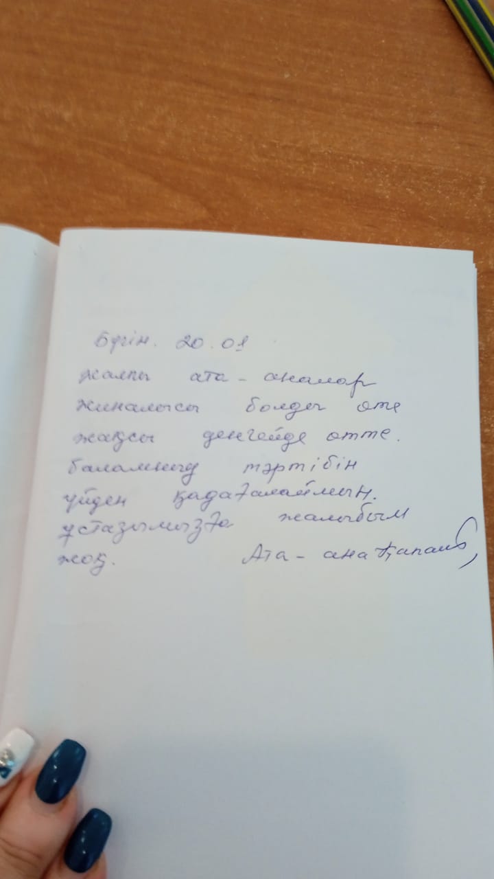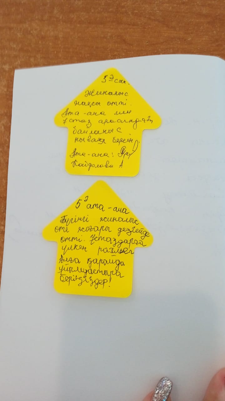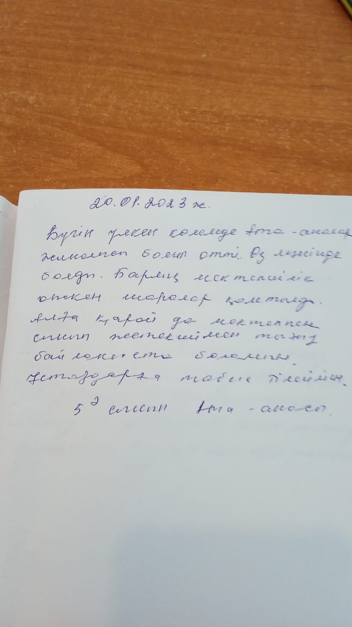 6.Марапаттау Жиналысқа сынып жетекші және мектеп әкімшілігі мен пән мұғалімдері қатысып, ата-аналар тарапынан ұсыныс, пікір дәптеріне жазба қалдырып кетті.