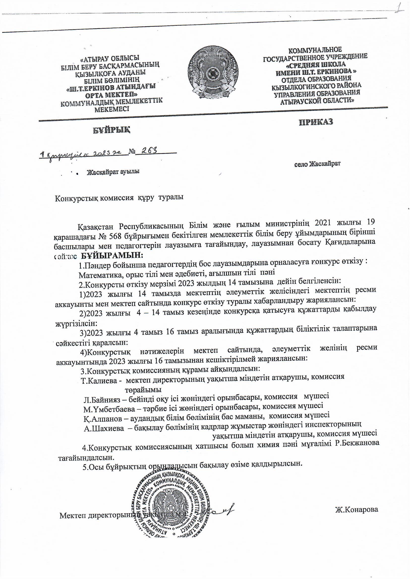 Конкурстық комиссия құру Бұйрығы