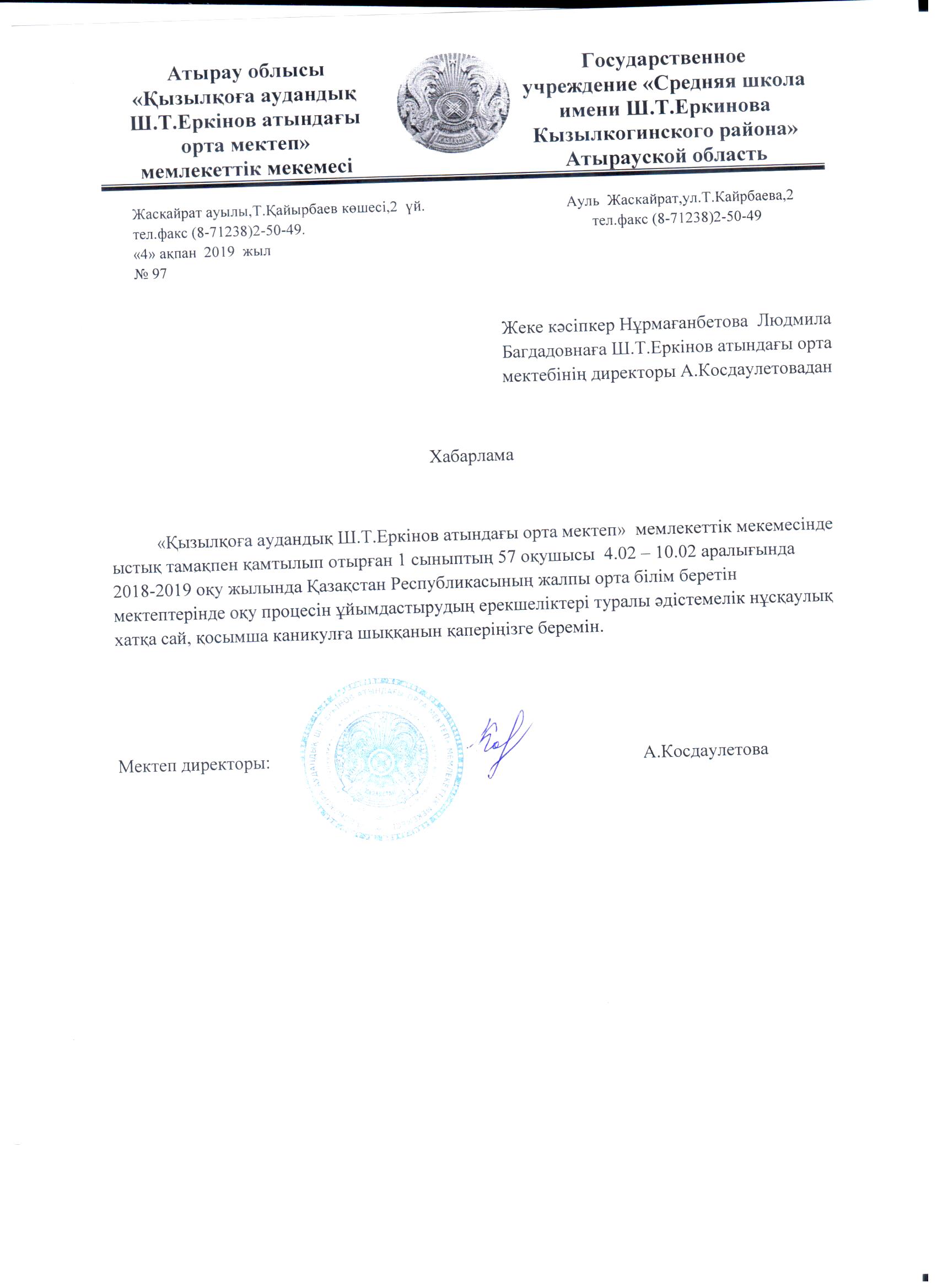 Білім беру ұйымының басшысы, басшының орынбасарлары туралы мәлімет