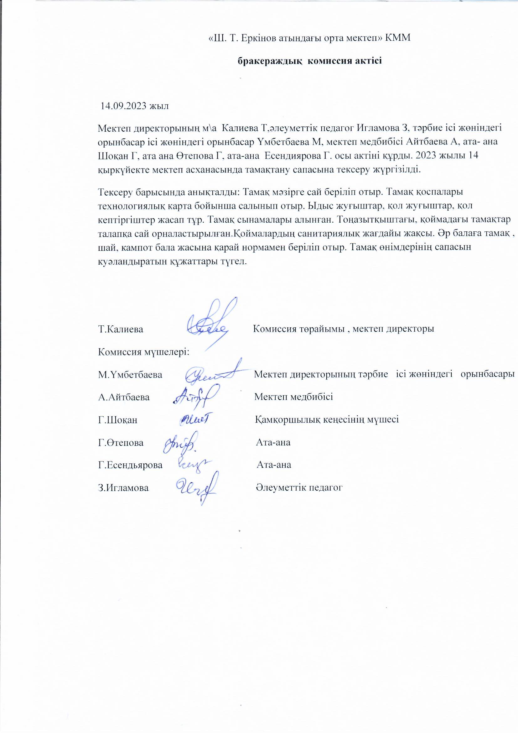 Бракераждық комиссия актісі 14.09.2023 жыл