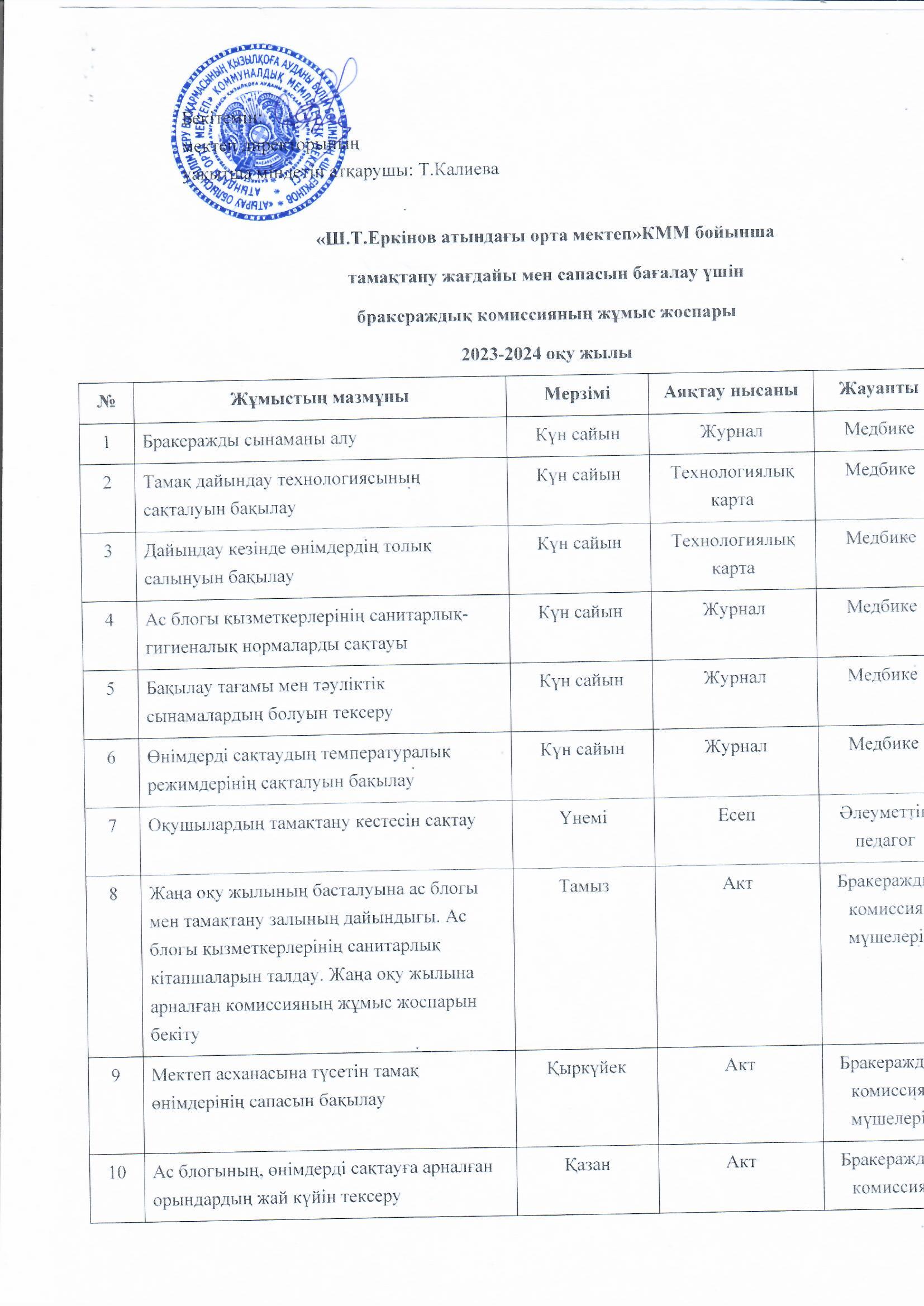 Тамақтану жағдайы мен сапасын бағалау үшін бракераж комиссиясының жұмыс жоспары