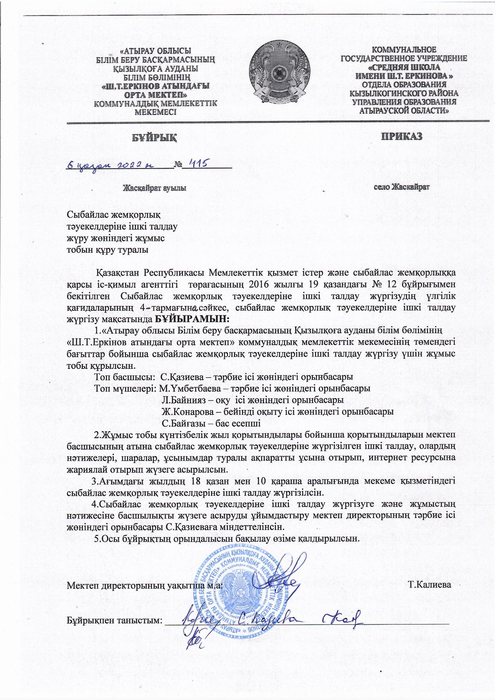 №415 бұйрық Сыбайлас жемқорлық тәуекелдеріне ішкі талдау жүргізу туралы