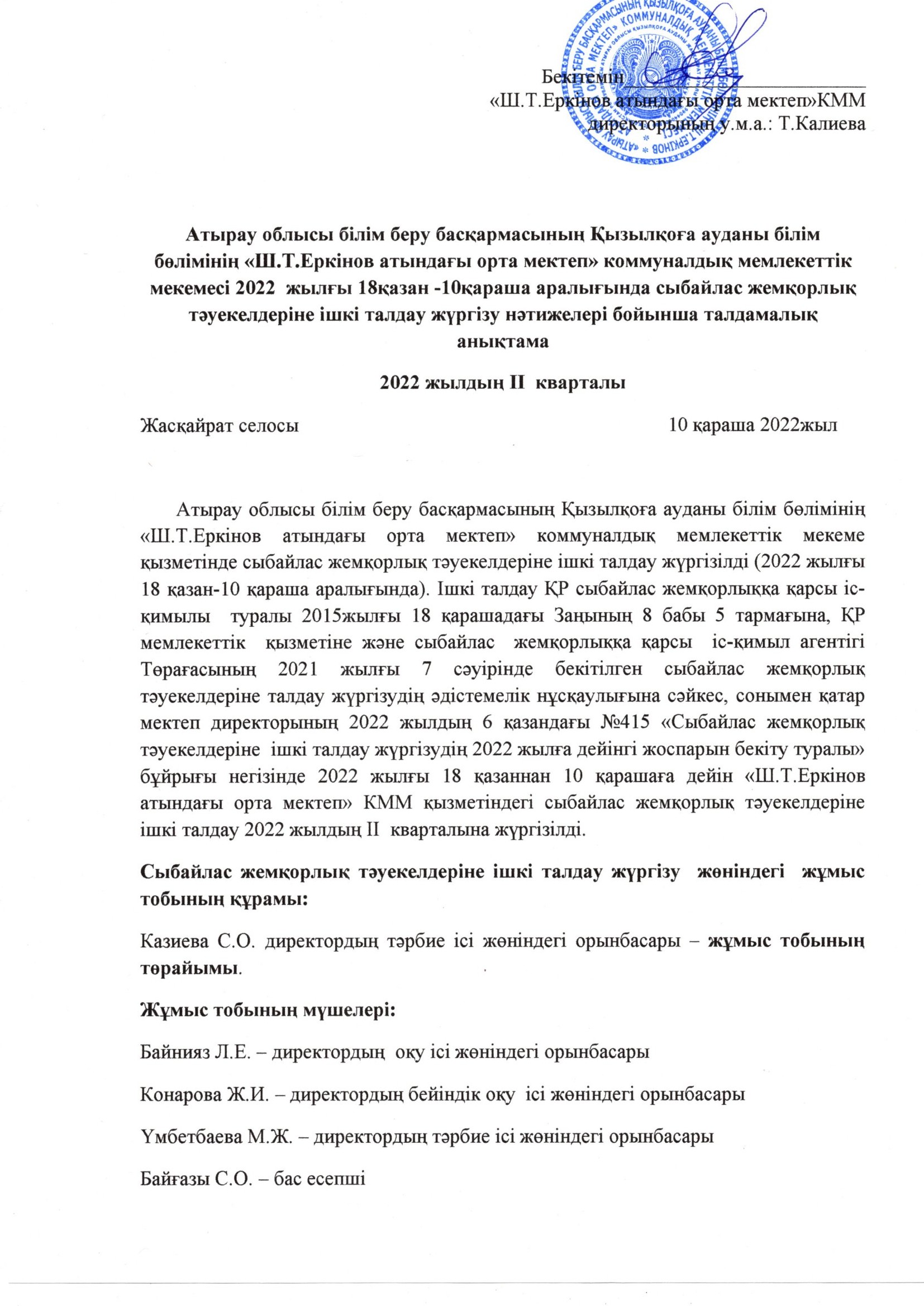 2022 жылғы 18 қазан -10қараша аралығында сыбайлас жемқорлық тәуекелдеріне ішкі талдау жүргізу нәтижелері бойынша талдамалық анықтама ІІ кварталы