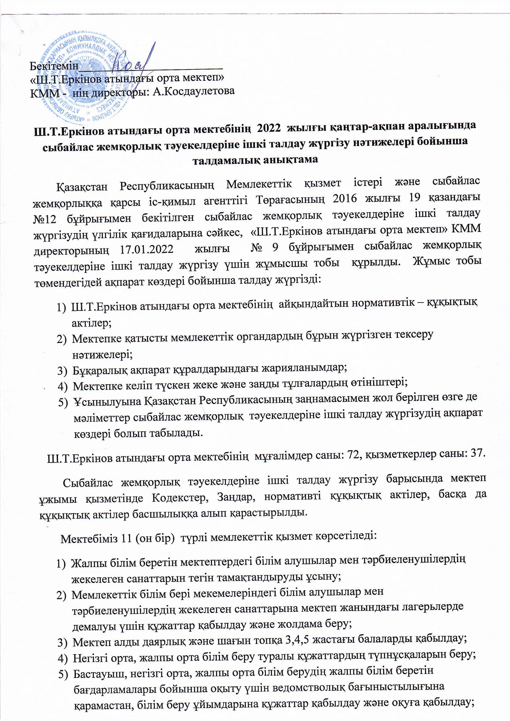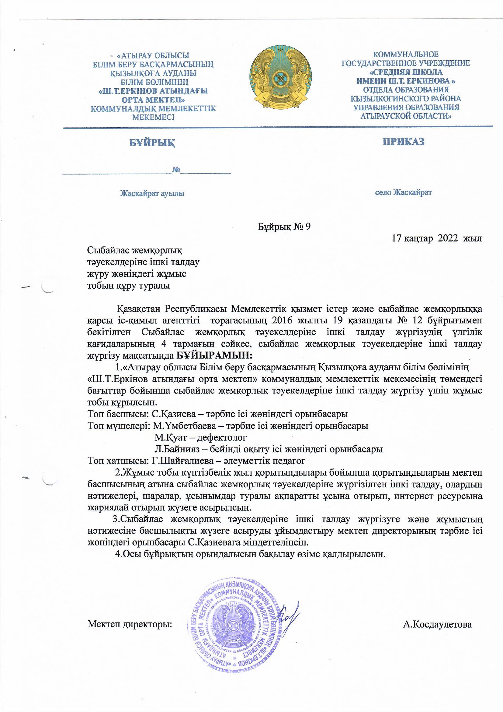 Сыбайлас жемқорлық тәуекелдеріне ішкі талдау жүргізу туралы бұйрық