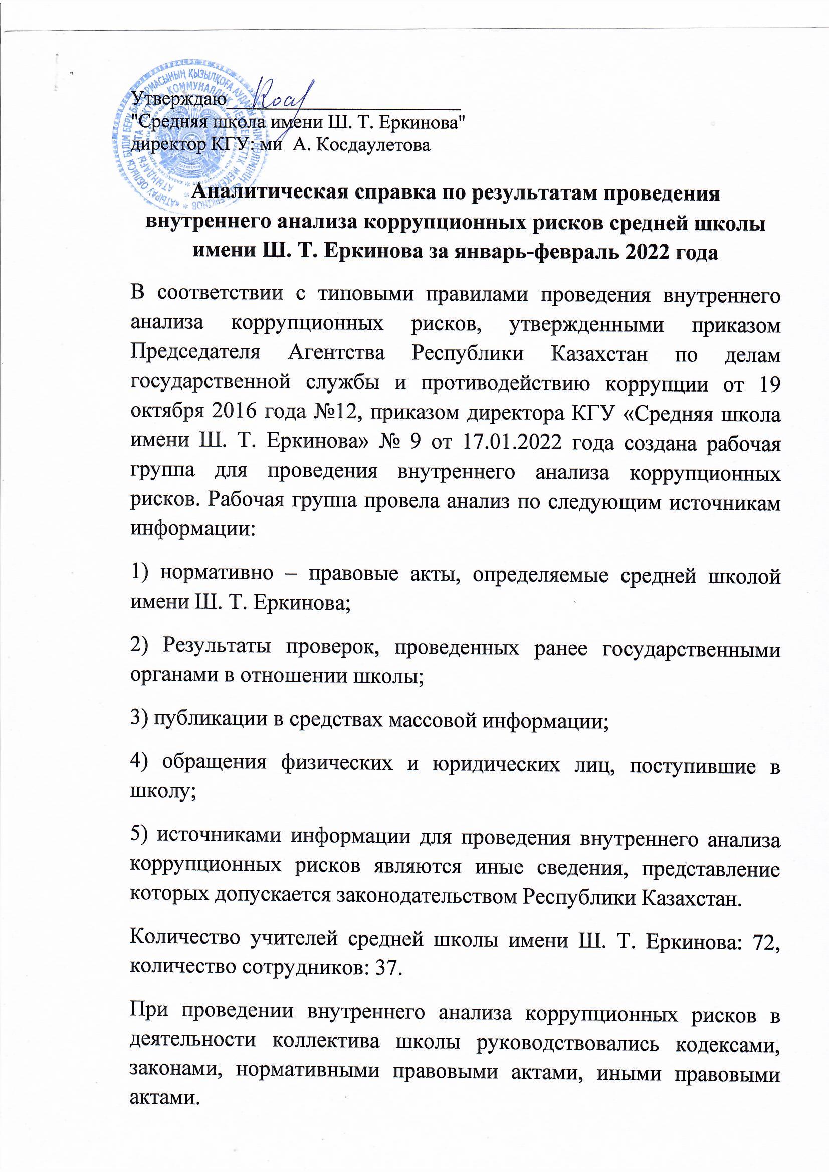 2022 жылғы қаңтар-ақпан аралығында сыбайлас жемқорлық тәуекелдеріне ішкі талдау жүргізу нәтижелері бойынша талдамалық анықтама