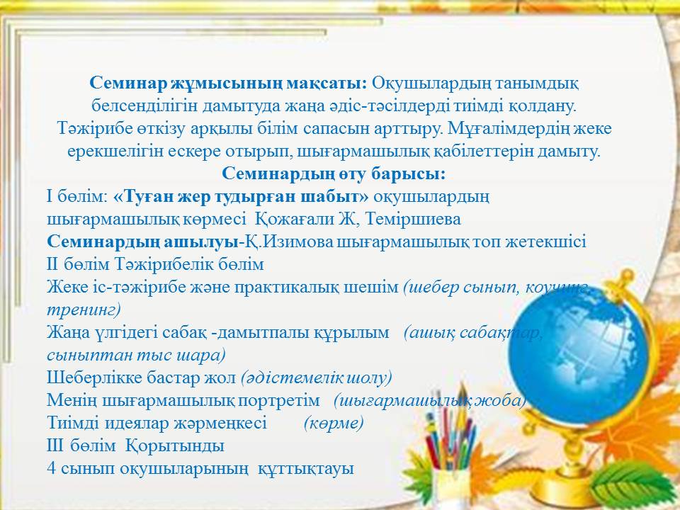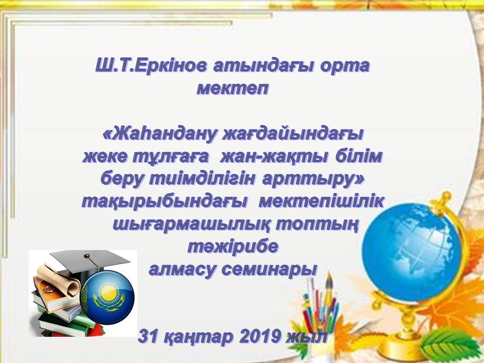 «Жаһандану жағдайындағы жеке тұлғаға жан-жақты білім беру тиімділігін арттыру» тақырыбындағы мектепішілік шығармашылық топтың тәжірибе алмасу семинары.