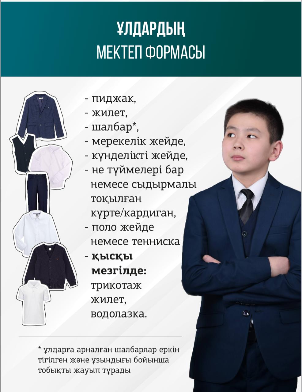 Ер балалар: мектеп формасын қатаң сақтауы тиіс, шаштары қысқа үлгіде алынған болуы керек.