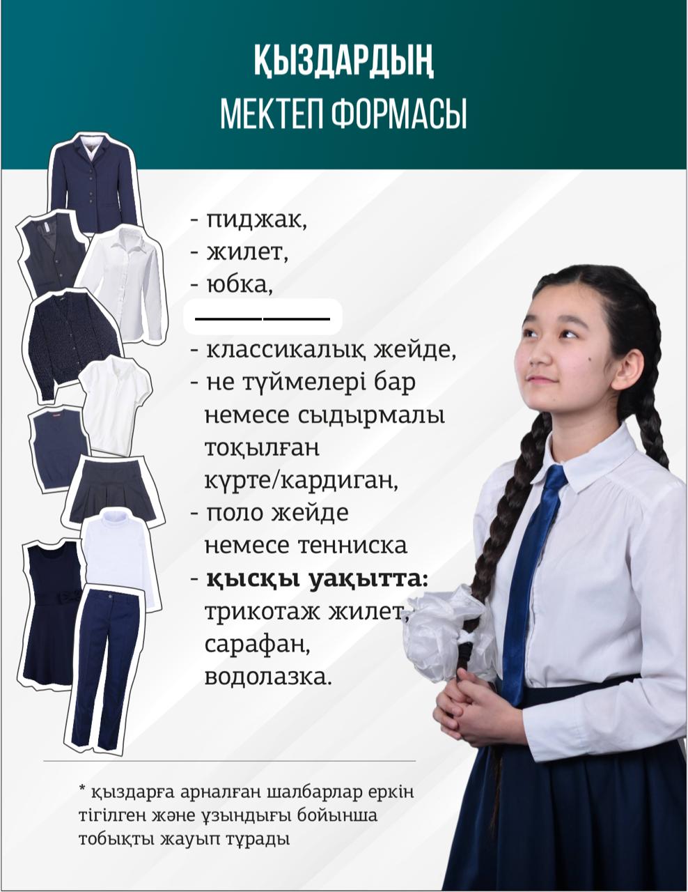 Қыз балалар: мектеп формасын қатаң сақтауы, шаштары екі жаққа өрілген, ақ бантик, тырнақтары алынған, ешқандай косметикалық бояу қолданбауы тиіс. Тырнақ, кірпік, шаш табиғи түрде болуы, басқа түске боялмауы және жасанды жолмен ұзартылмауы қатаң талап етіледі.